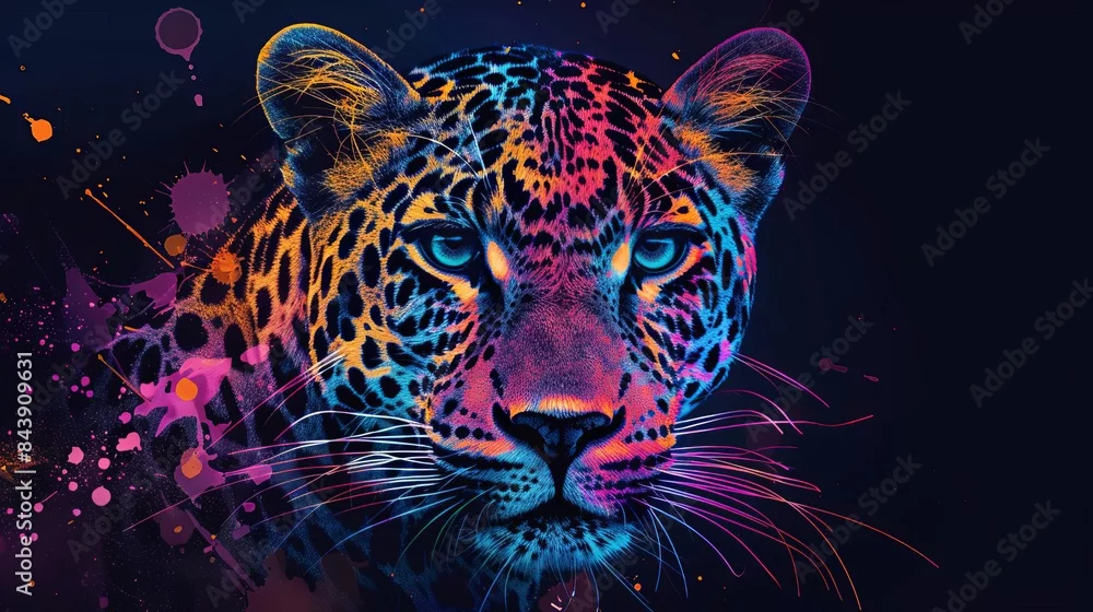 Fototapeta neon leopard black background pop art Illustration of a leopard in neon colors on a black background in the pop art style and splatters of watercolor paint