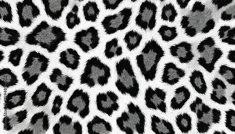 Fototapeta Seamless black, white snow leopard print texture featuring animal spots. This abstract background pattern mimics fur, ideal for textile, fashion design, wallpaper, or wrapping paper applications.
