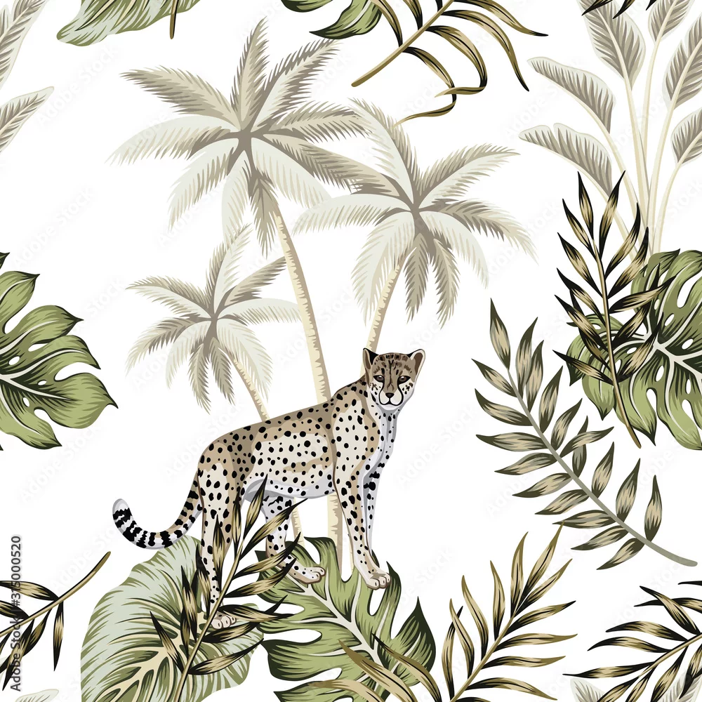 Fototapeta Tropical vintage botanical landscape, palm tree, palm leaves, leopard animal floral seamless pattern white background. Exotic jungle animal wallpaper. - pantery - Picturewall.pl