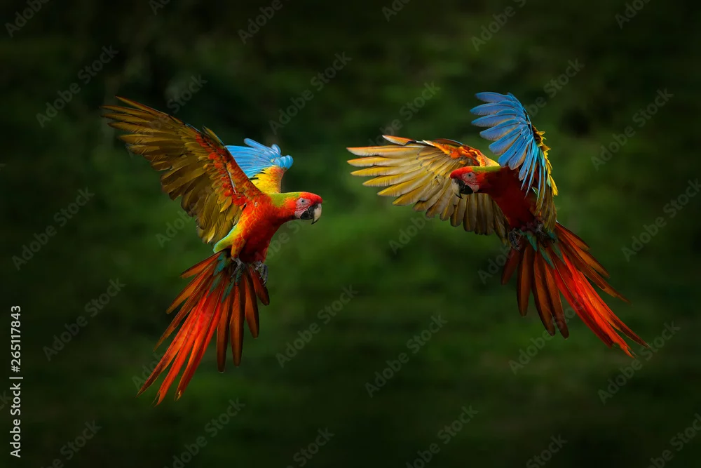 Fototapeta Czerwona hybrydowa papuga w lesie. Papugi Ara latające w ciemnozielonej roślinności. Rzadkie formy Ara Macao x Ara ambigua, w tropikalnym lesie, Kostaryka. Scena przyrody z tropikalnej przyrody. Ptak w locie, dżungla.