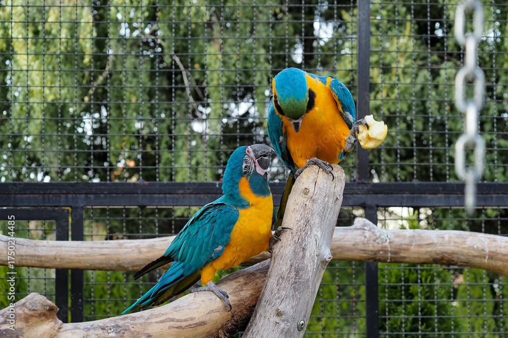 Fototapeta Dwie papugi ary na drewnianej gałęzi w wolierze dla ptaków tropikalnych.