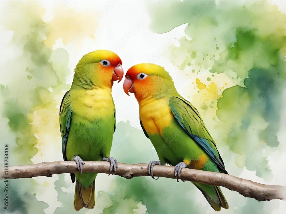 Fototapeta Żywy obraz akwarelowy przedstawiający dwie zielone i żółte papugi siedzące na gałęzi na kolorowym tle. - papugi - Picturewall.pl
