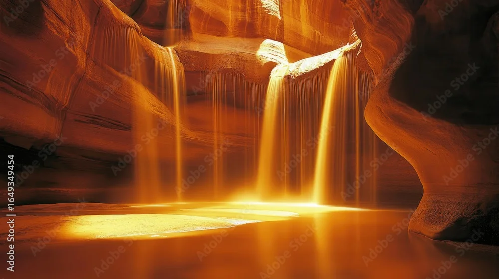 Fototapeta Beautiful Antelope Canyon scene with glowing orange walls and sand falling like mist from rock ledges in Arizona