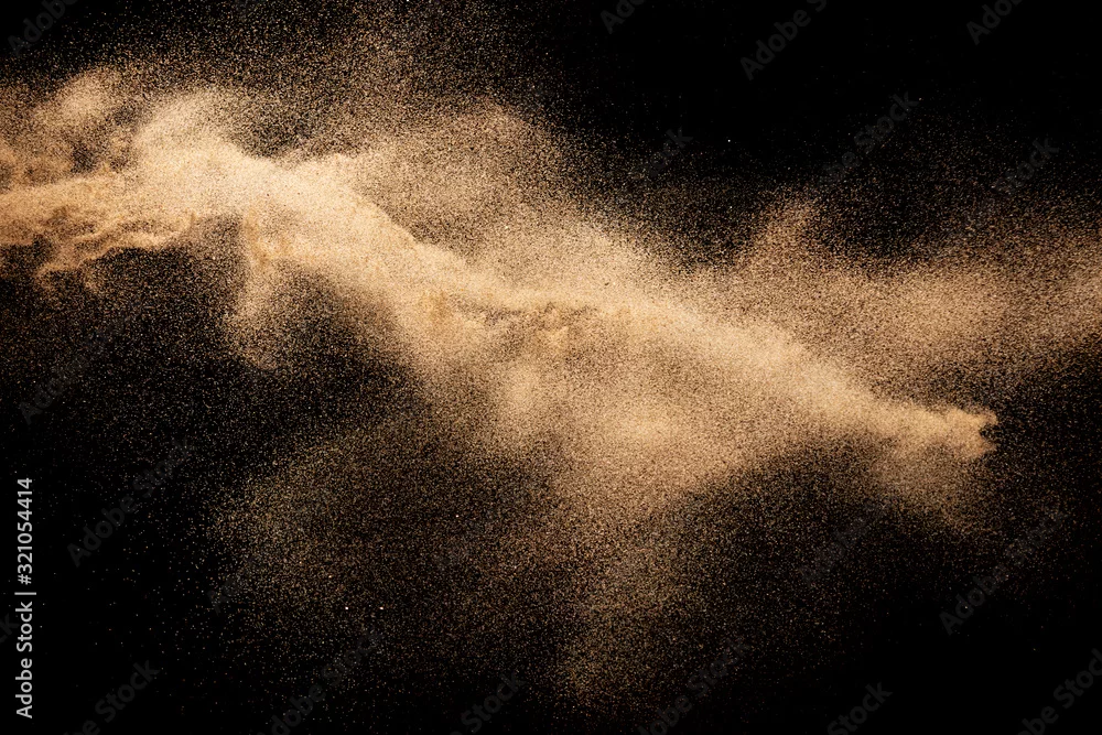 Fototapeta Brown dry river sand explosion isolated on black background. Abstract sand splash. - piasek - Picturewall.pl