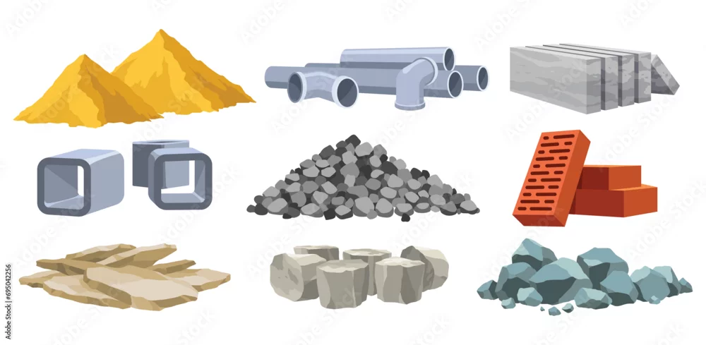 Building materials. Construction concept. Illustrations can be used for construction sites or illustrate renovation works. Bricks, planks, metal, sand and stone pipes vector set