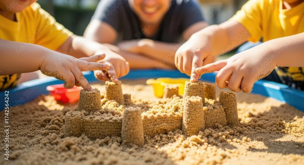 Fototapeta Children Playing with Sandcastle in Bright Outdoor Playground Scene - piasek - Picturewall.pl