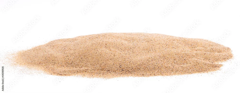 Fototapeta Desert sand pile, dune isolated white background. Gold White fine Sands on Beach island, destination of tropical ocean. Studio shot for detail texture, copy space