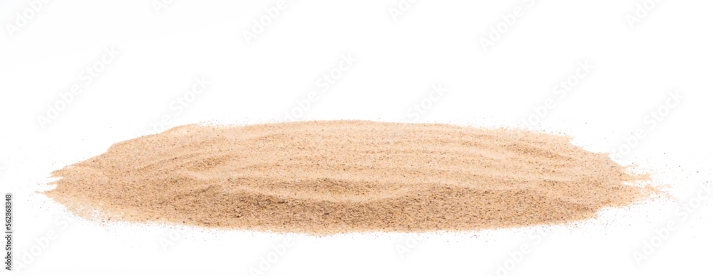 Desert sand pile, dune isolated white background. Gold White fine Sands on Beach island, destination of tropical ocean. Studio shot for detail texture, copy space