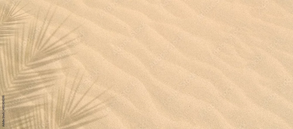 Palm tree leaf shadow on sand background, Natural shadow from tropical coconut palm leaves on beach sand. top view, copy space. Summer vacation concept. Mockup for product or travel background