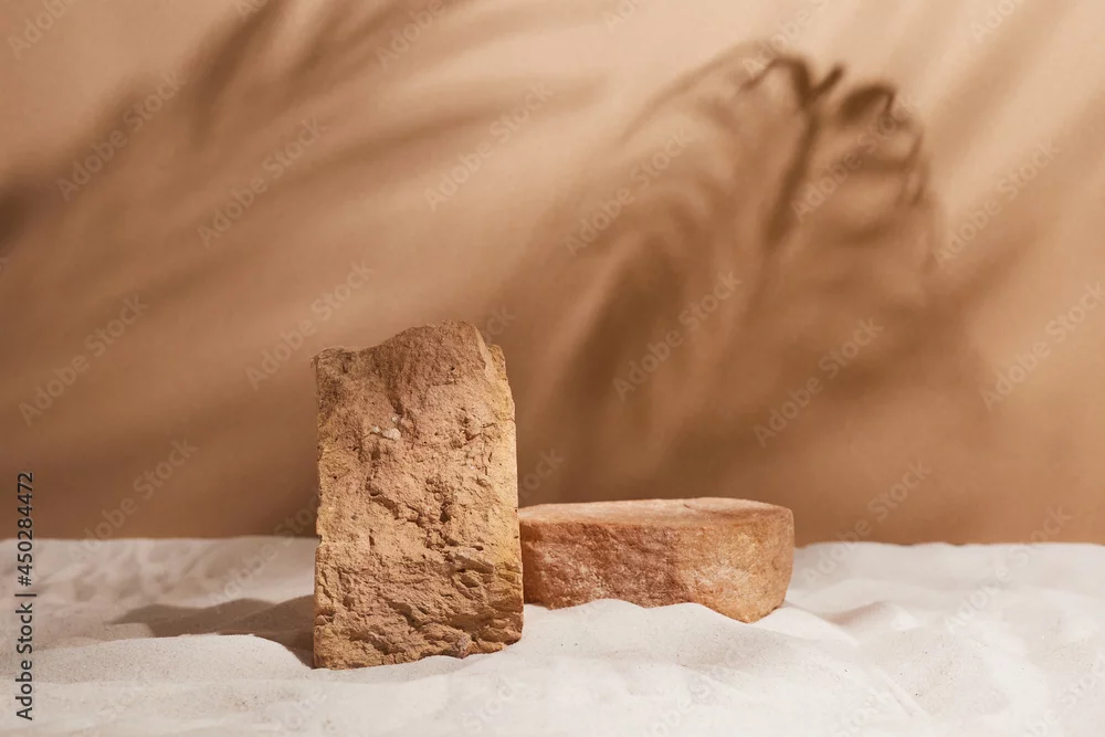 Fototapeta Podium on sand background. Display with sunshade and shadow on the background for cosmetic perfume fashion natural product
