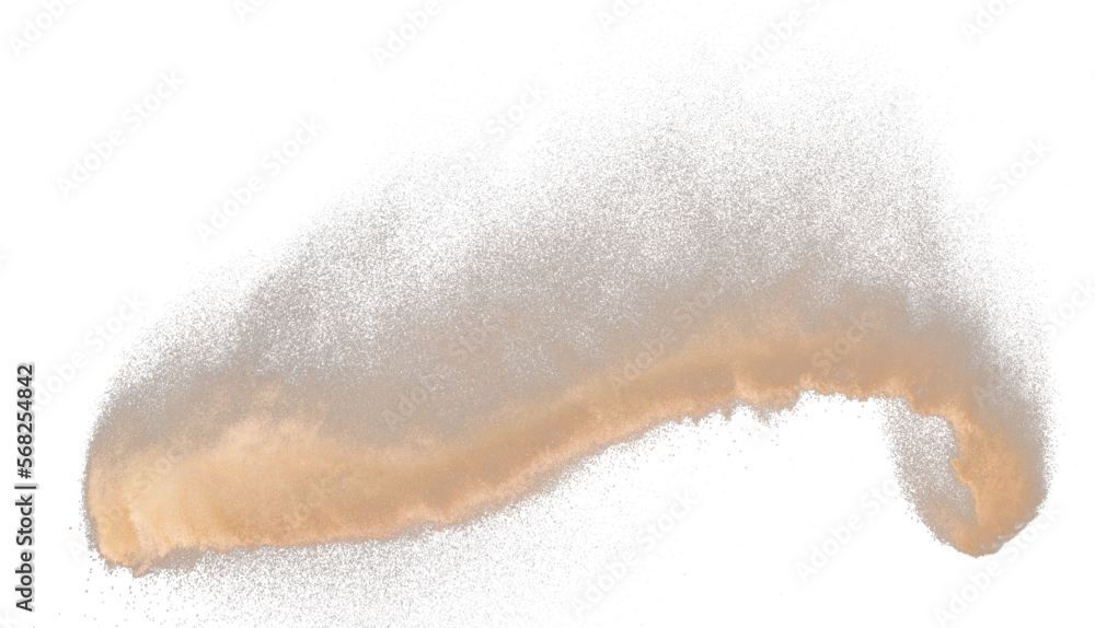 Small size fine Sand flying explosion, Golden grain wave explode. Abstract cloud fly. Yellow colored sand splash silica in Air, Galaxy star universe sign symbol. Element Black background Isolated
