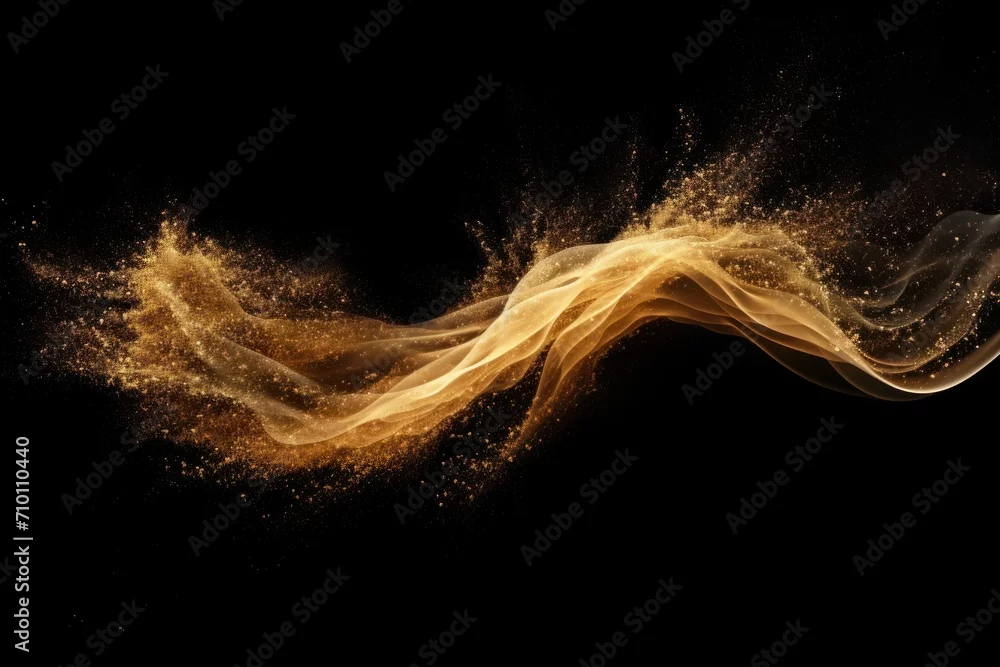 Small size fine Sand flying explosion Golden grain wave explode. Abstract cloud fly. Yellow colored sand splash silica in Air Galaxy star universe sign symbol. Element Black background Isolated