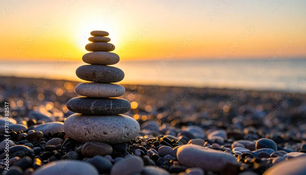 Fototapeta Zen stack of stones and pebbles on the beach sand symbolizing balance and harmony for relaxation and calm near the sea and sky - piasek - Picturewall.pl