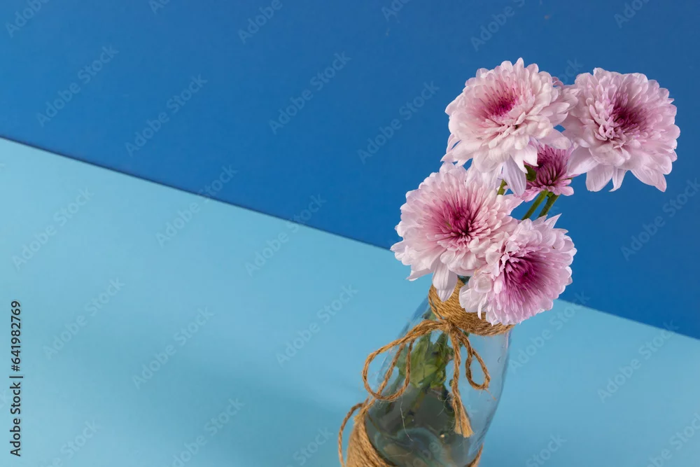 Fototapeta Pink flowers in glass vase and copy space on blue background