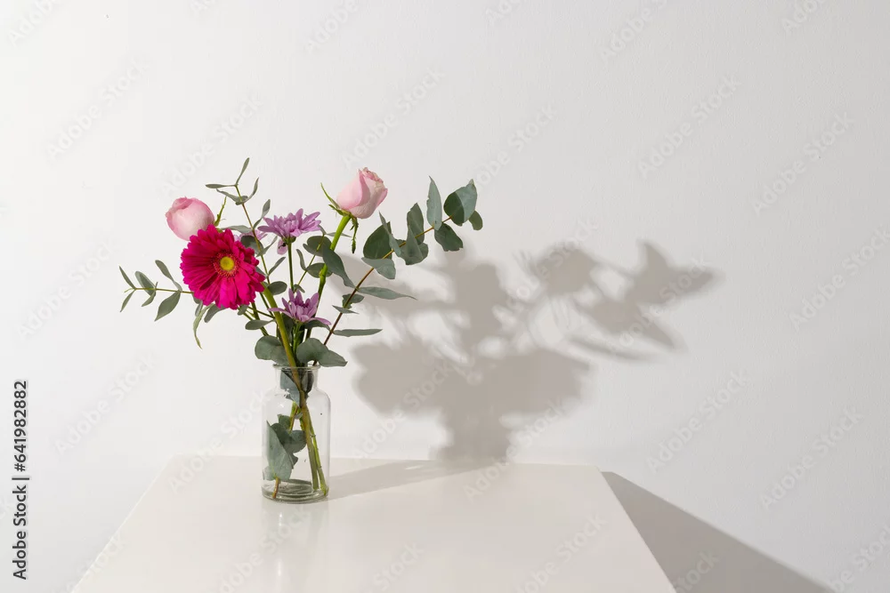 Fototapeta Pink flowers in glass vase and copy space on white background - Picturewall.pl