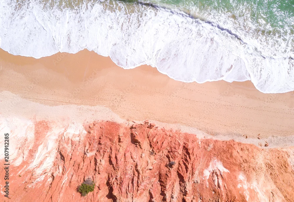 Fototapeta Widok z lotu ptaka na egzotyczną piaszczystą plażę i ocean z czystą turkusową wodą.