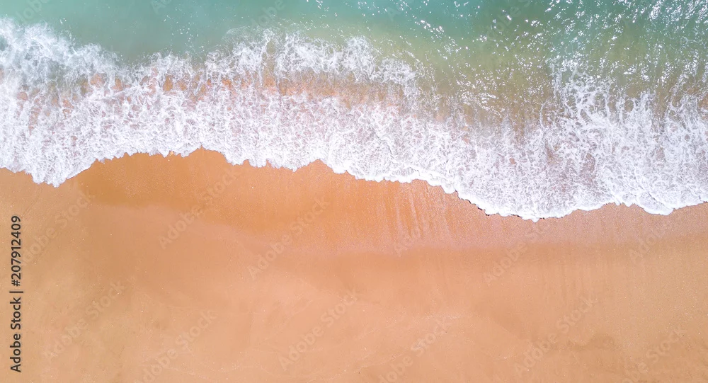 Fototapeta Widok z lotu ptaka tropikalna piaskowata plaża i ocean. Skopiuj miejsce
