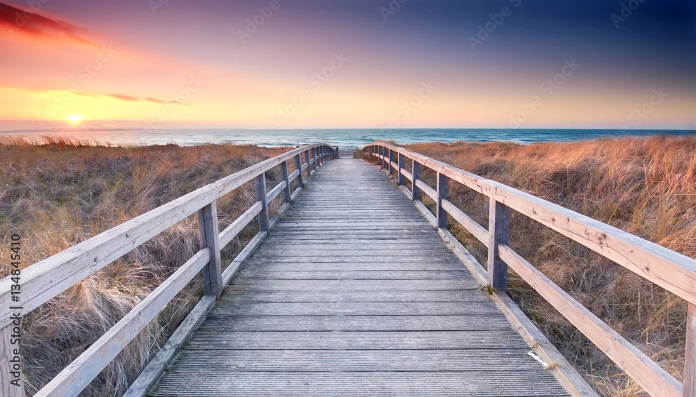 Fototapeta pomost prowadzący na plażę o zachodzie słońca