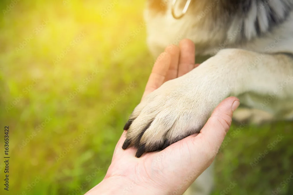 Fototapeta a man holds the paw of the dog in the Park in the summer at sunset. the concept of friendship, teamwork, love