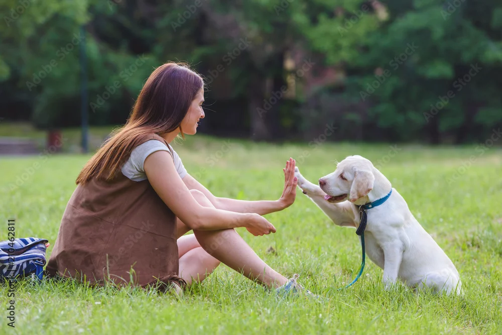 Fototapeta Beautiful young girl playing with a puppy Labrador in the park