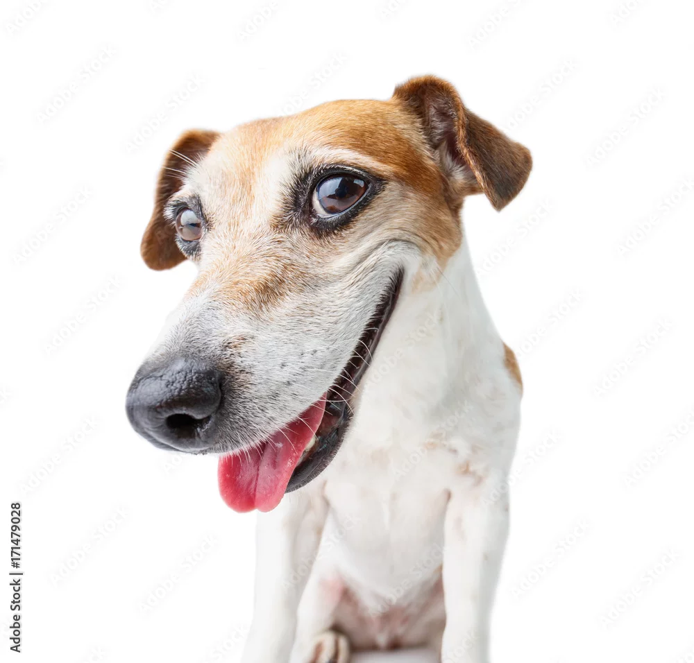 Fototapeta confident dog muzzle staring to you! Smiling happy Jack Russell terrier. White background