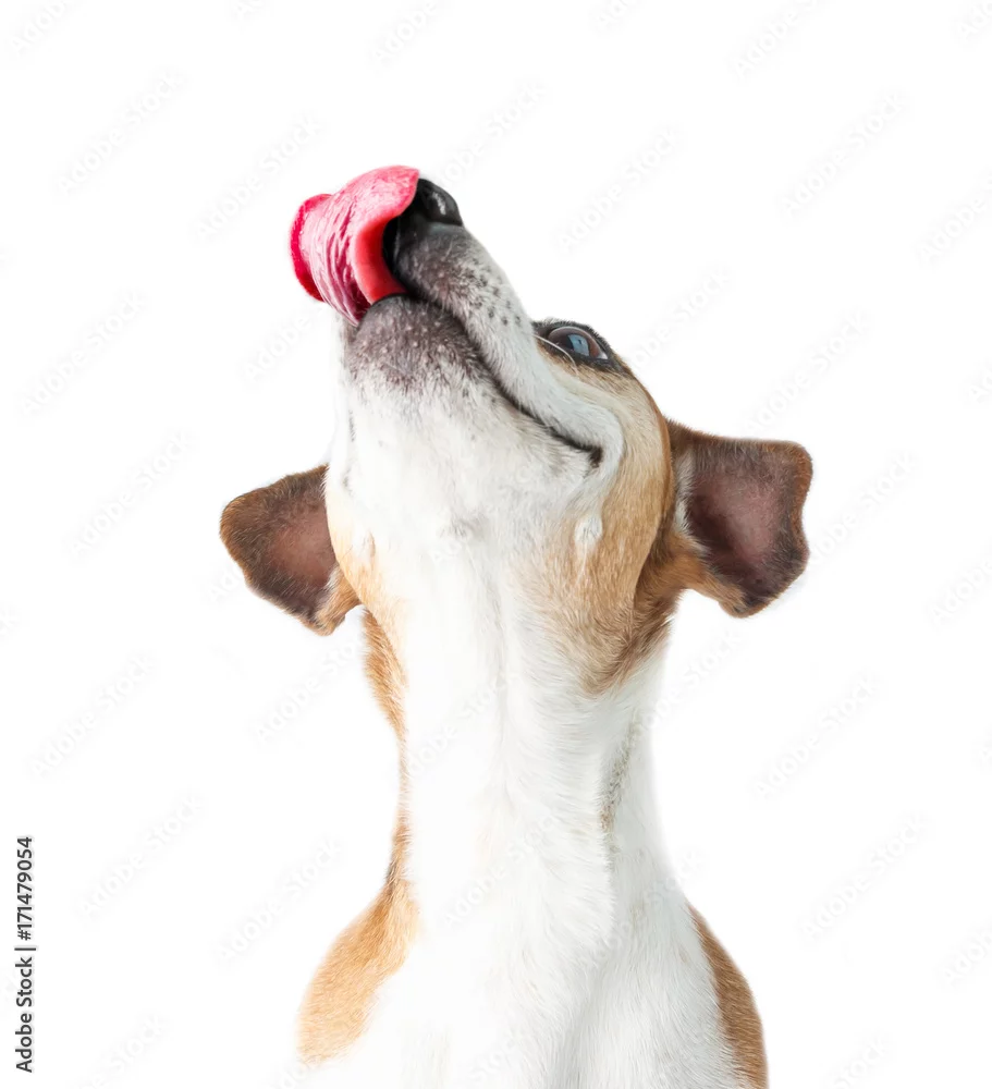 Fototapeta Contented dog muzzle. looks up. A hungry pet and an appetite for a delicious meal. White background