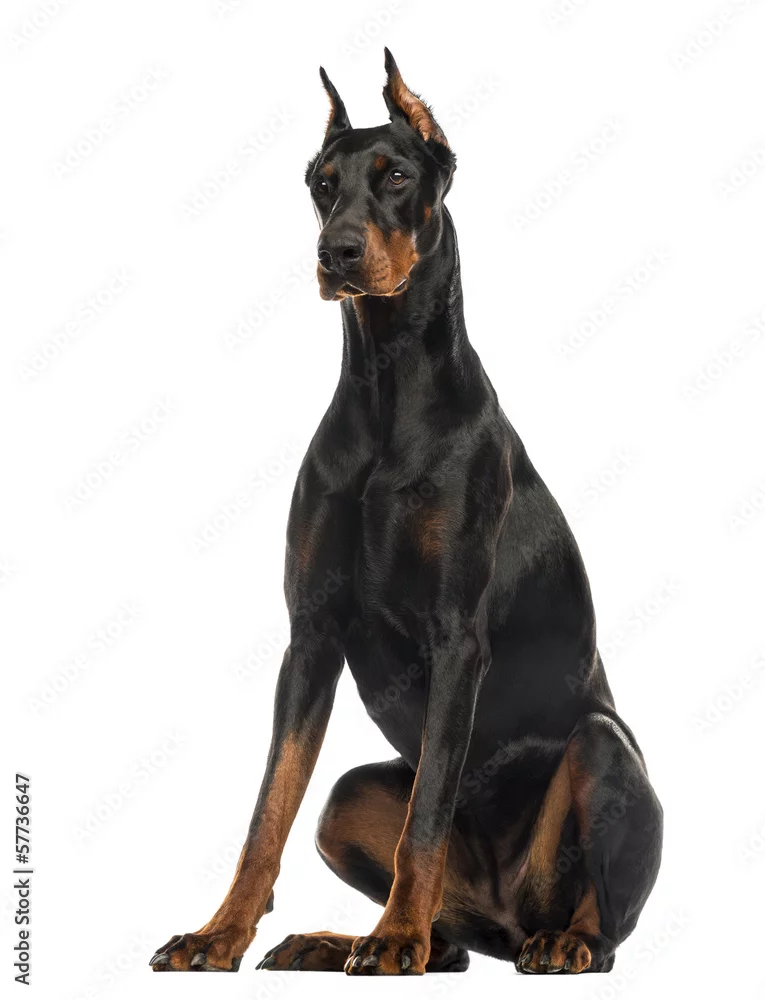 Fototapeta Doberman Pinscher sitting, isolated on white - psy - Picturewall.pl