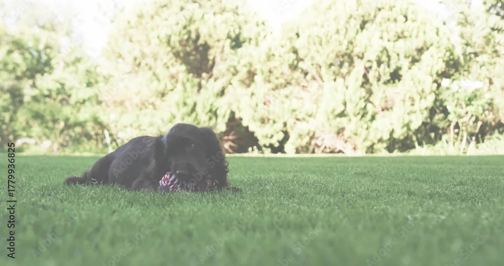 Fototapeta Lounging black medium-breed dog gripping red and white rope toy on residential lawn, sunlit shrubs