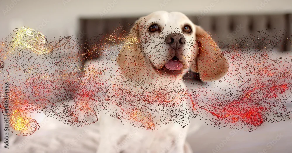 Fototapeta Resting beagle-like dog facing camera on bedding in bedroom with dark headboard, glitter overlay - psy - Picturewall.pl