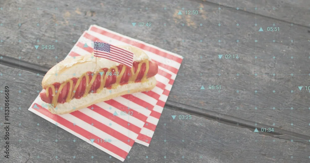 Fototapeta Sitting hot dog on picnic table, with American flag toothpick and blue overlay, copy space