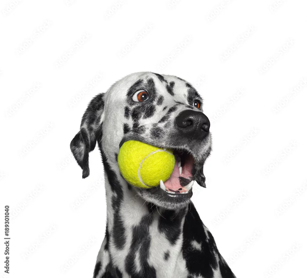 Fototapeta Śliczny dalmatyński pies trzyma piłkę w usta. Pojedynczo na białym