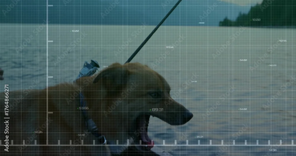 Fototapeta Standing brown dog wearing harness collar and leash panting in lake water, tree-covered shoreline