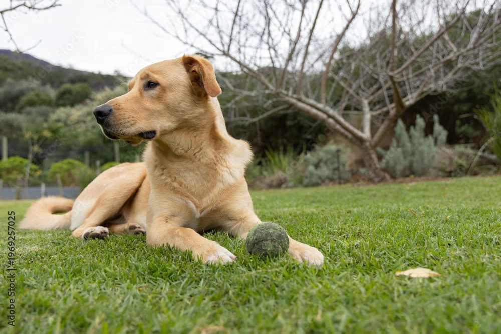 Fototapeta Tan Labrador-type dog lying on trimmed lawn in residential garden with mossy tennis ball nearby - psy - Picturewall.pl