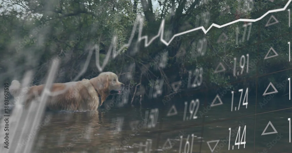 Fototapeta Wading golden retriever with collar in shallow stream with ripples and plants, with financial chart - psy - Picturewall.pl