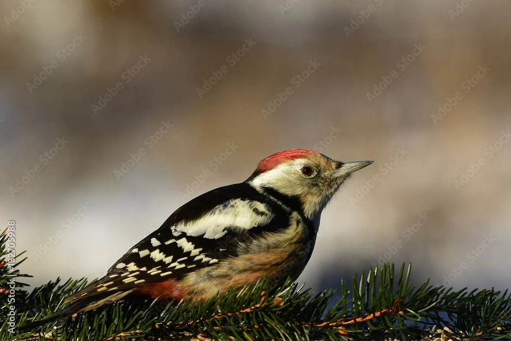 Fototapeta Dzięcioł średni (Dendrocopos medius) w pobliżu miejsca dokarmiania ptaków na skraju ponadstuletniego lasu.