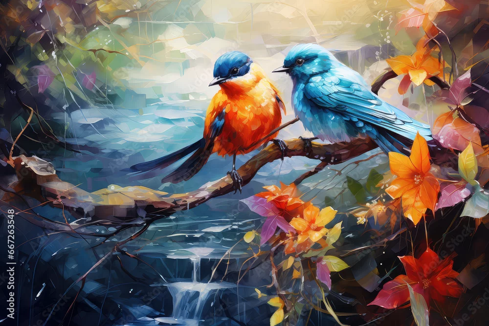 Fototapeta Kolorowy obraz przedstawiający ptaki nad rzeką w lesie. - ptaki - Picturewall.pl