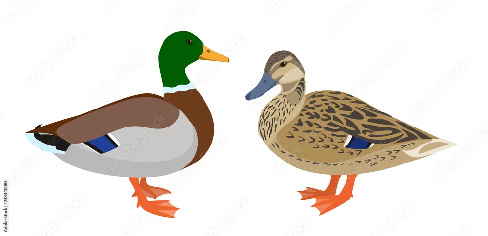 Fototapeta Drake i karmazynki kaczki odizolowywać na białym tle, para mallard kaczki, wektorowa ilustracja - ptaki - Picturewall.pl