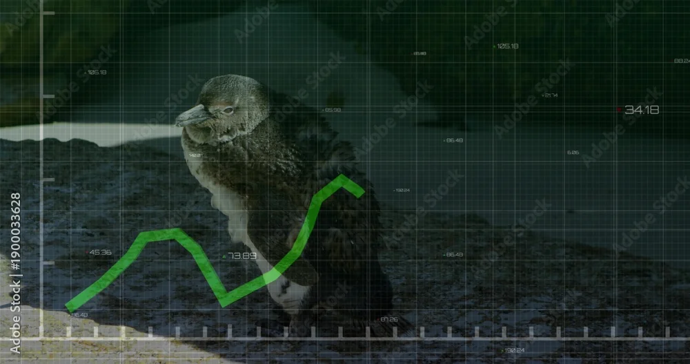 Fototapeta Standing lone penguin tilting head on rocky pebble shoreline, with HUD grid and green graph