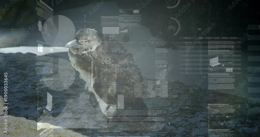 Fototapeta Standing penguin chick perching on textured wet rock at shoreline, showing faint data overlays