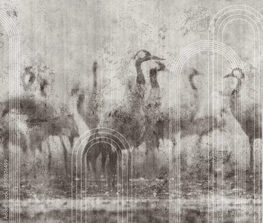 Fototapeta Textured background with beautiful cranes. Illustration for wallpaper, mural, poster, card, interior decoration.