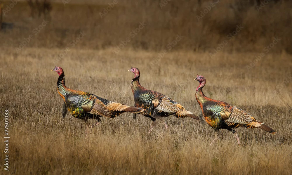 Fototapeta Wild turkeys with amazing color walk through field - ptaki - Picturewall.pl