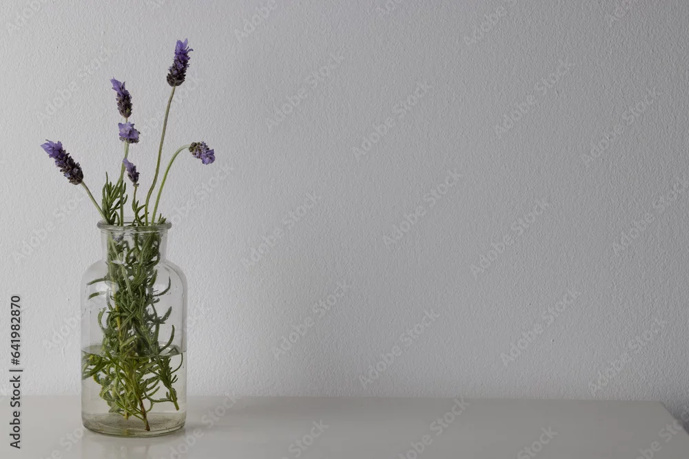 Fototapeta Purple lavender flowers in glass vase and copy space on white background