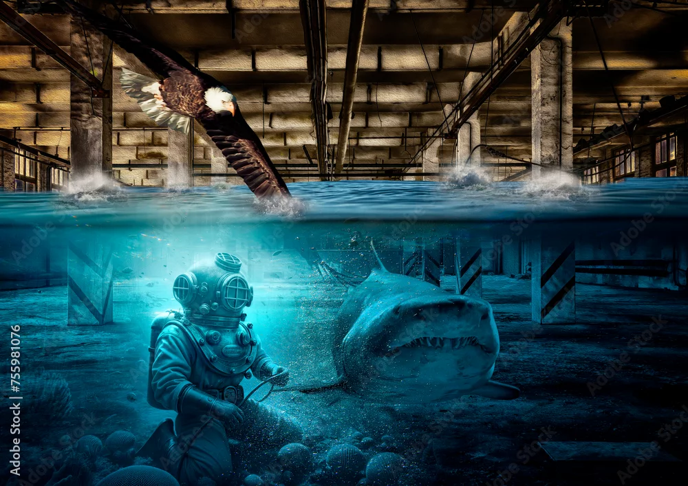 Fototapeta Grafika przedstawia fotorealistyczny obraz nurka, który z niezachwianą odwagą i ciekawością przemierza zatopione przestrzenie fabryki. Towarzyszy mu rekin, symbolizujący nie tylko niebezpieczeństwa.
