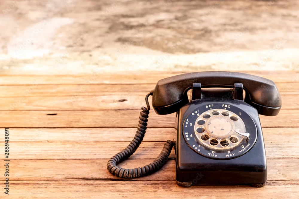 Fototapeta Retro obrotowy czarny telefon na drewno stołu tle. Stary telefon z tarczą obrotową.