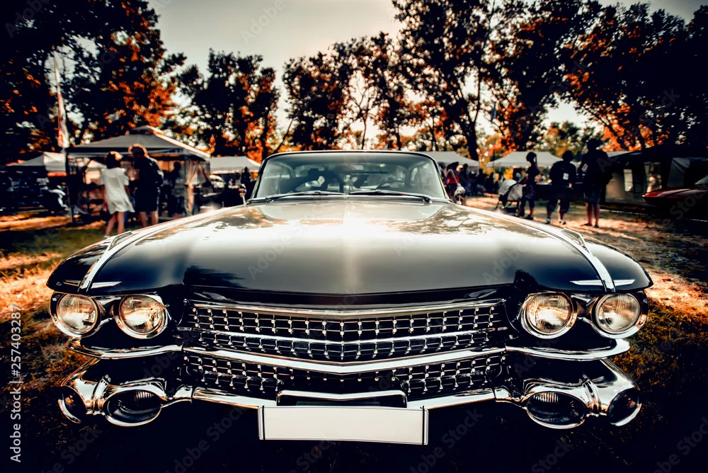 Fototapeta Zbliżenie szerokokątne zdjęcie czarnego rocznika samochodu retro z błyszczącą chromowaną osłoną chłodnicy, zderzakiem i reflektorami