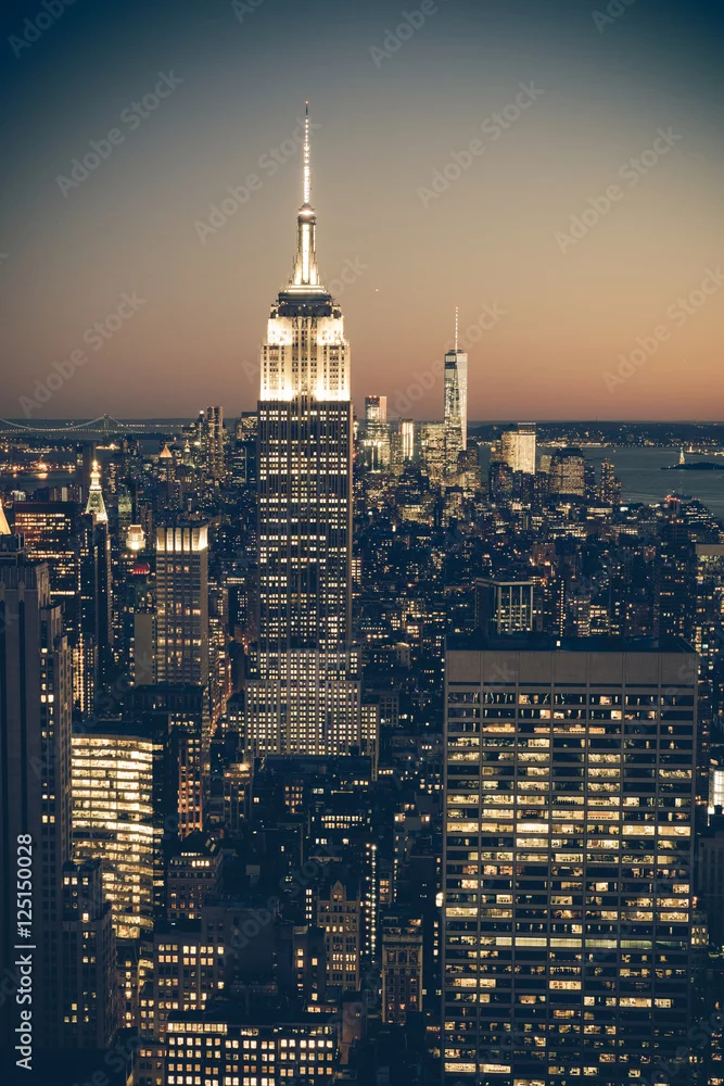 Fototapeta Rocznika brzmienia wizerunek Miasto Nowy Jork przy półmrokiem z budynkami i światłami