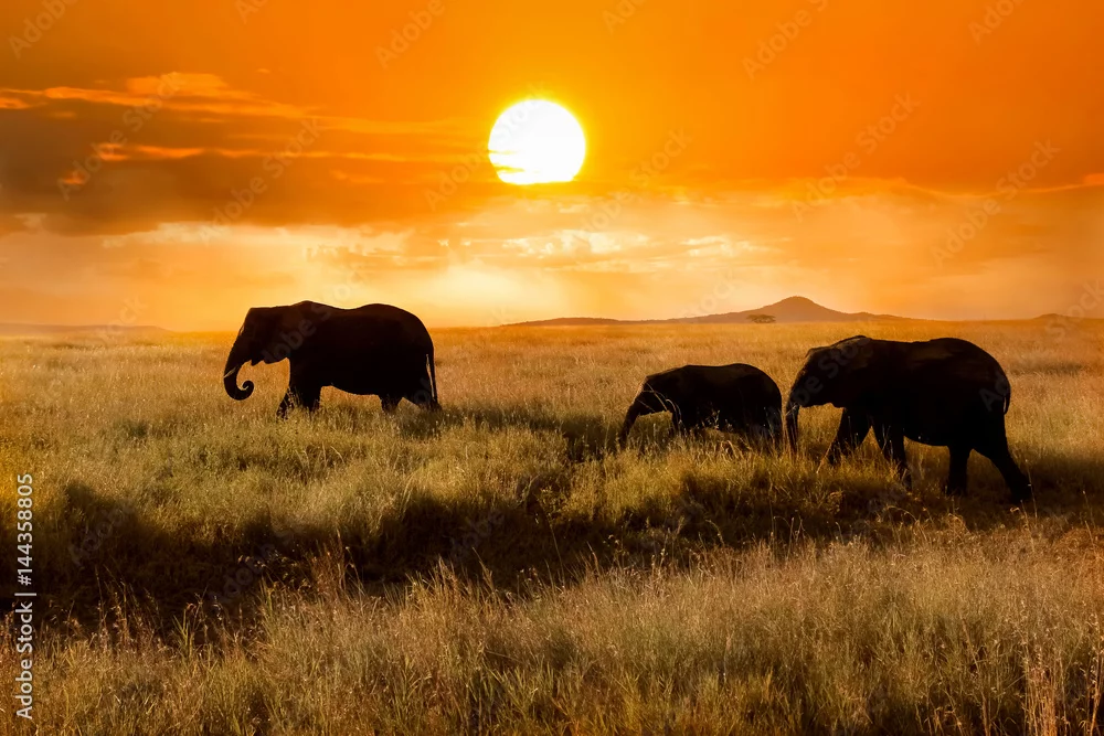 Fototapeta Rodzina słoni o zachodzie słońca w parku narodowym Afryki