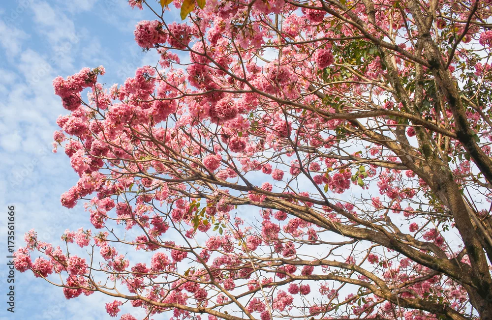 Fototapeta Różowe kwiaty i błękitne niebo - Picturewall.pl