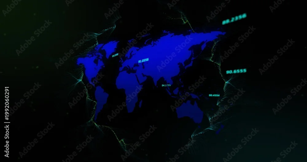 Fototapeta Displaying stylish deep blue world map glowing in virtual studio, with neon labels and filaments - ryby - Picturewall.pl