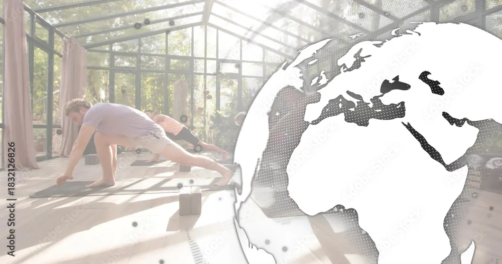 Fototapeta Doing deep lunges, four adults in workoutwear in glass studio with mats, blocks, globe, copy space